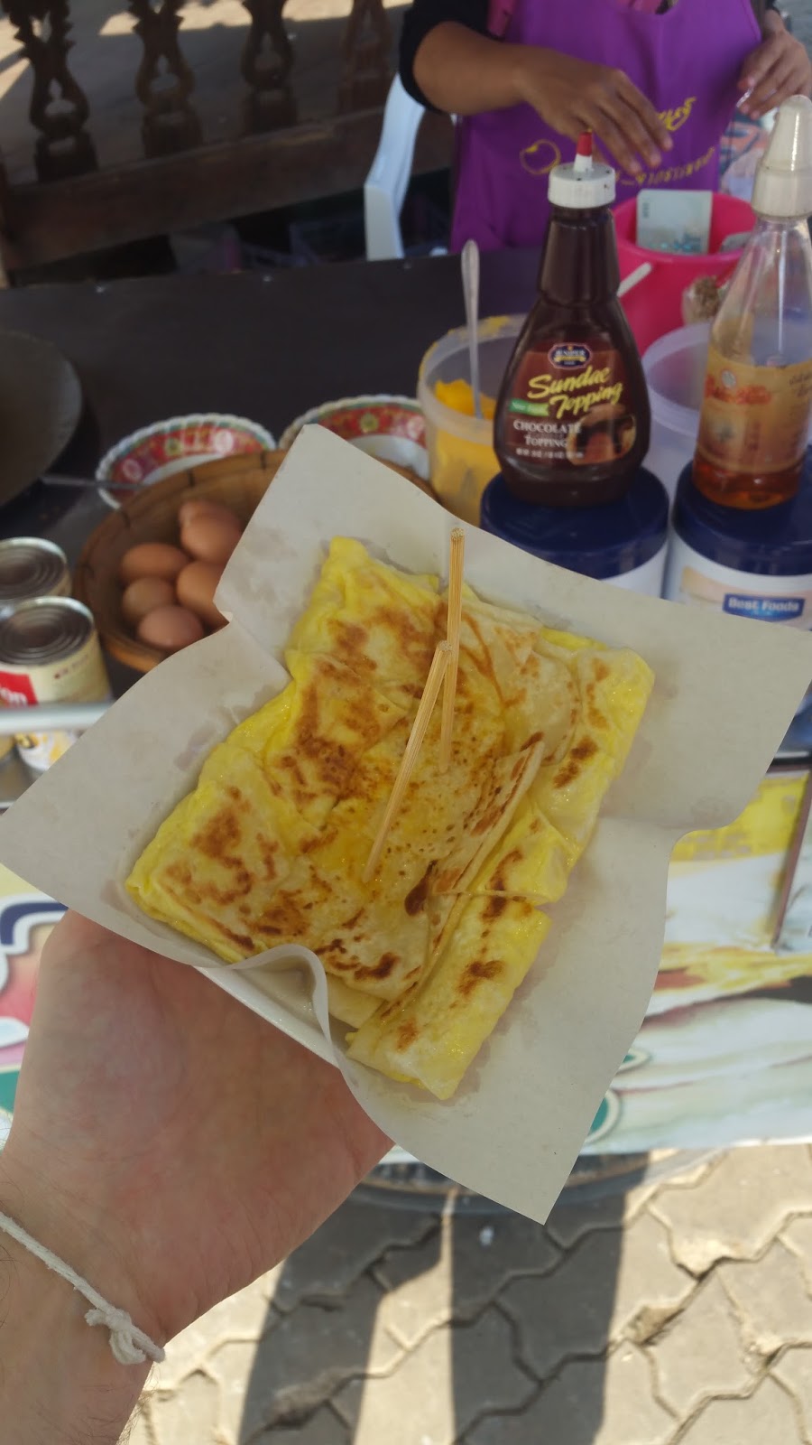 I had this egg Roti about 1 hour outside Chiang Mai on the way to Chiang Rai. This version was filled with Eggs, and could have used, salt (or Fish Sauce!).